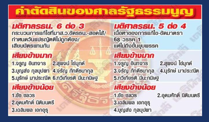 ในกรณี 6:3 เสียงข้างน้อย บอก ไม่สามารถรับพิจารณา /ไม่ขัดรัฐธรรมนูญ คือ นายชัช นาย อุดมศักดิ์ และ นาย เฉลิมผล