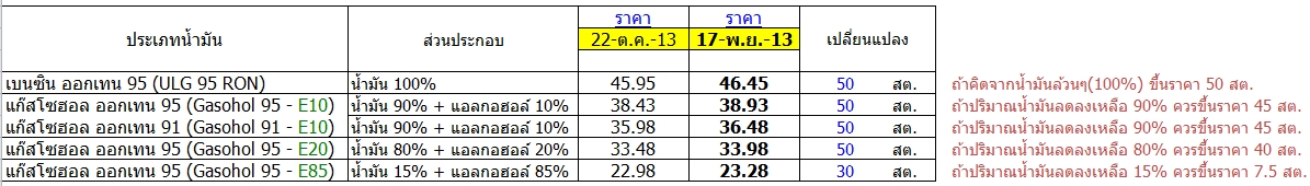 ถ้าน้ำมันเบนซิน 95 ซึ่งเป็นน้ำมันล้วนๆ 100% ขึ้นราคา 50 สตางค์ต่อลิตร ดังนั้น น้ำมันบางประเภท เช่น E85 ซึ่งมีน้ำมันผสมอยู่แค่ 15% (มีความแตกต่างกับเบนซินแท้ๆอย่างมีนัยสำคัญแน่นอน) ทำไมถึงไม่ขึ้นราคาตามสัดส่วนที่ควรจะเป็น คือ 7.5 สตางค์ แต่กลับขึ้นราคาไปถึง 30 สตางค์ มันไม่น่าจะถูกต้อง