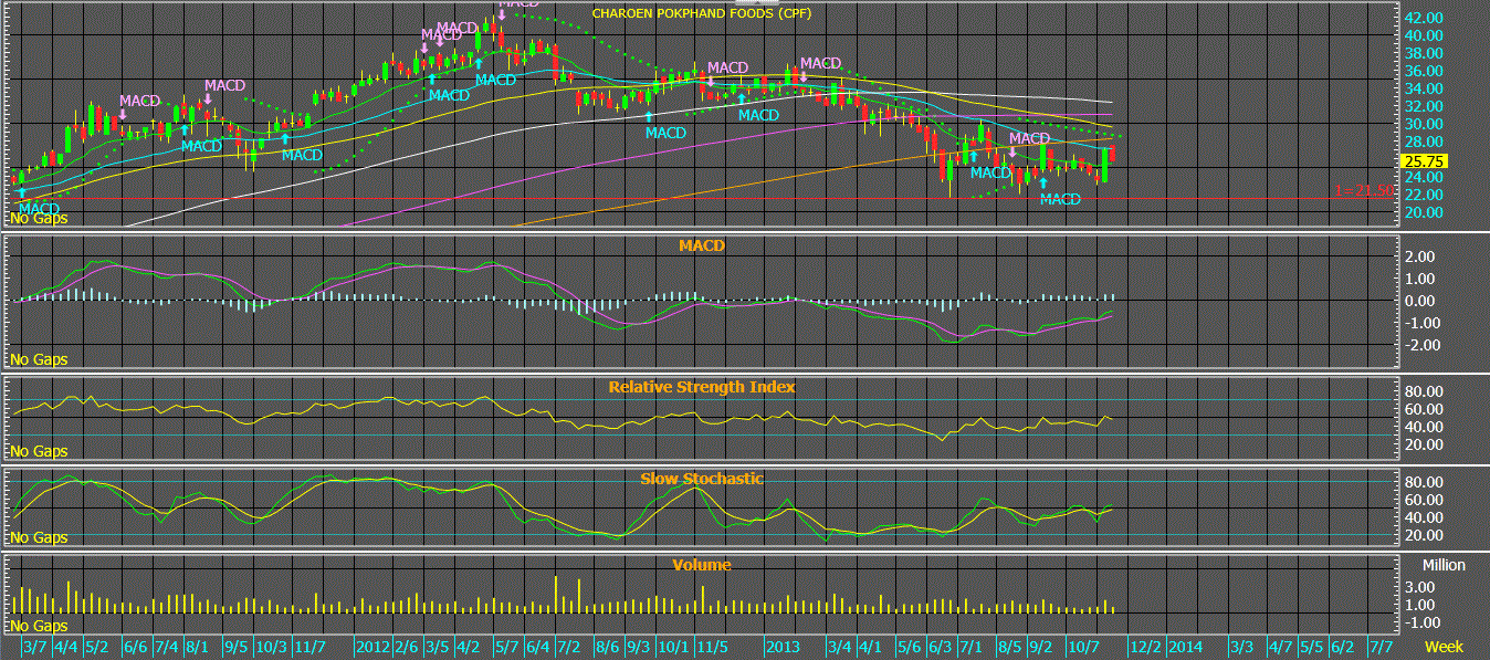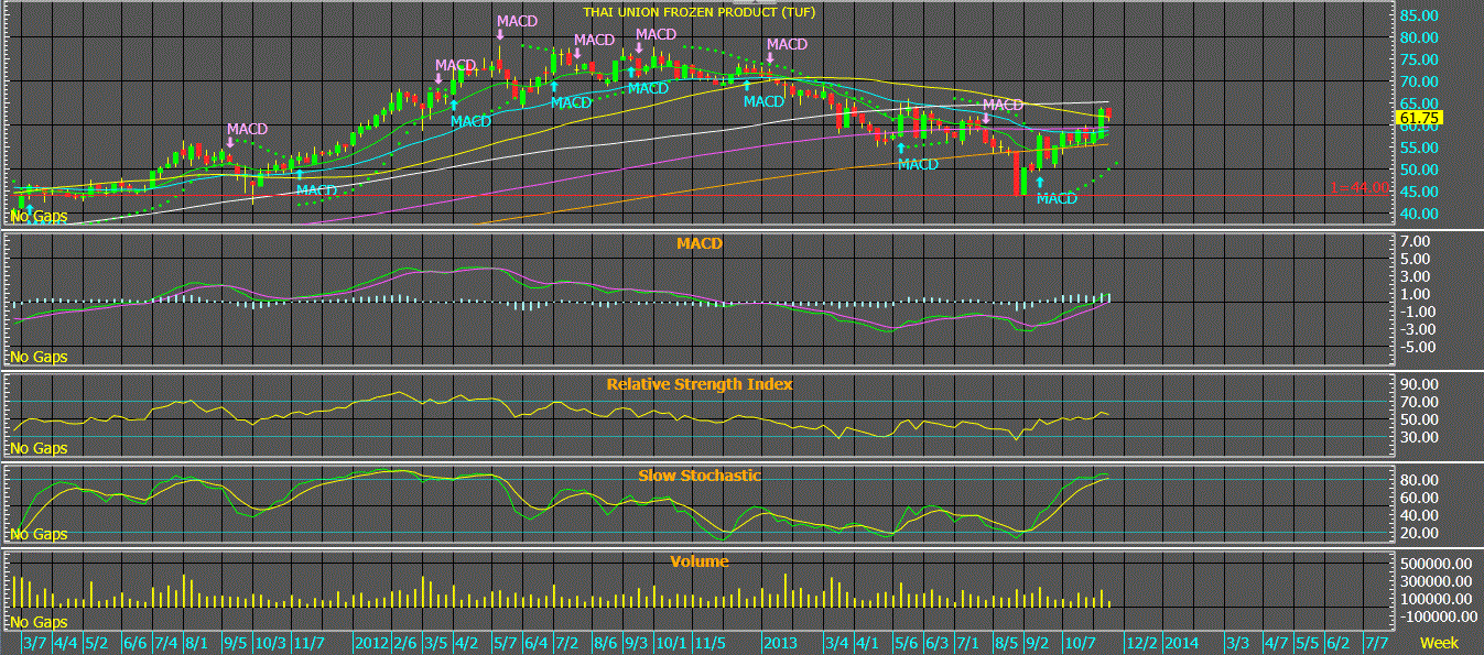 By วชิราลักษณ์ แสงเลิศศิลป์ชัย การส่งออกโดยรวมของไทยในปี 2556 มีแนวโน้มว่าจะเหลืออัตราการเติบโตเพียง 1% จากปีก่อนเท่านั้น สาเหตุสำคัญไม่เพียงเพราะเงินบาทแข็งค่า แต่ปัญหาภายในของแต่ละอุตสาหกรรม เช่น กุ้ง เผชิญโรคกุ้งตายด่วน ทำให้ไม่มีซัพพลายกุ้งมากพอทำการผลิตเพื่อส่งออกให้ลูกค้าประจำได้ ธุรกิจไก่ส่งออกก็มีผู้ประกอบการรายใหญ่ประสบปัญหาทางด้านการเงินทำให้ผลิตป้อนให้ลูกค้าของตัวเองไม่ได้ ทำให้อัตราการเติบโตของการส่งออกไทย ที่เคยโตต่อเนื่องเป็นเลข 2 หลัก ต้องฟุบลงตามไปด้วย ครั้งนี้เราจะกล่าวถึงการส่งออกของอุตสาหกรรมย่อยบางประเภท ที่ภาวะโดยรวมของอุตสาหกรรมก็ไม่ได้สดใสนัก แต่บริษัทจดทะเบียนที่ทำธุรกิจในอุตสาหกรรมนั้น บางแห่งสามารถทำกำไรได้สูงสุดเป็นประวัติการณ์ในช่วงที่ภาวะธุรกิจมีปัญหาจากภาครวม เราจะยกตัวอย่างขึ้นมา คืออุตสาหกรรมไก่ ทูน่า และกุ้ง ซึ่งผู้ประกอบการทั้ง GFPT และ TUF สร้างปรากฏการณ์ทำกำไรดีสวนภาพรวมอุตสาหกรรม จึงนำมาเป็นกรณีศึกษา อุตสาหกรรมไก่ : ในปี 2556 นี้ สมาคมผู้เลี้ยงไก่เพื่อการส่งออกของไทย คาดการณ์ไว้แต่ต้นปีว่าปริมาณการส่งออกไก่ปีนี้จะมากถึง 620,000 ตันต่อปี โดยคาดว่าเติบโต 12.25% YoY จากปีก่อนที่ปริมาณส่งออกอยู่ที่ 552,362 ตันต่อปี แต่ผ่านมาถึง 11 เดือน คาดว่าจะไม่เป็นไปตามคาดการณ์ จึงคาดหวังว่าจะส่งออกในปีนี้ได้เพียง 530,000 ตันต่อปี ลดลง 4% จากปีก่อน ทั้งนี้เพราะภาพรวมทั้งอุตสาหกรรม มีผู้ประกอบการที่มีส่วนแบ่งตลาดใหญ่เป็นอันดับ 2 เกิดปัญหาสภาพคล่องทางการเงิน นั่นคือ สหฟาร์ม ดังเป็นข่าวปรากฏในสื่อต่างๆ แต่พอเราพิจารณาลงไปที่รายตัวหุ้นของอุตสาหกรรมนี้ GFPT เป็นผู้ประกอบการที่ทำธุรกิจผลิตเนื้อไก่โดยตรง เราพบว่า GFPT กลับประกาศกำไรที่สูงสุดเป็นประวัติการณ์ ในไตรมาส 3/56 ที่ 607 ล้านบาท +39,444% YoY และ 101% QoQ เพราะราคาเนื้อไก่ทั้งในประเทศและส่งออกปรับตัวเพิ่มสูงขึ้น ปริมาณการขายของ GFPT เองก็สูงขึ้นกว่าเดิม ทั้งนี้มีผลส่วนหนึ่งมาจากซัพพลายของสหฟาร์มที่หายไป ประกอบกับราคาวัตถุดิบคืออาหารสัตว์ ประกอบด้วยข้าวโพดและถั่วเหลืองปรับตัวลดลงต่อเนื่อง ทำให้อัตรากำไรขั้นต้นในไตรมาส 3/56 นี้ อยู่สูงมากถึง 18.2% จากปกติ 13-15% ก็เก่งแล้ว เรายังเชื่อว่าภาวะกำไรของ GFPT นี้อยู่ในช่วงกลางของวัฏจักร ยังไม่ถึงขั้นปลายวัฏจักร ซึ่งด้วยกำไรที่ประกาศออกมาอย่างนี้ GFPT ยังเป็นหุ้นที่ Undervalued (ราคาหุ้นต่ำกว่ามูลค่าที่แท้จริง) อุตสาหกรรมกุ้ง-ทูน่า : ในปี 2556 ผลผลิตกุ้งไทยอยู่ในขั้นวิกฤติจากการเผชิญโรคกุ้งตายด่วน ผลผลิตกุ้งในประเทศ