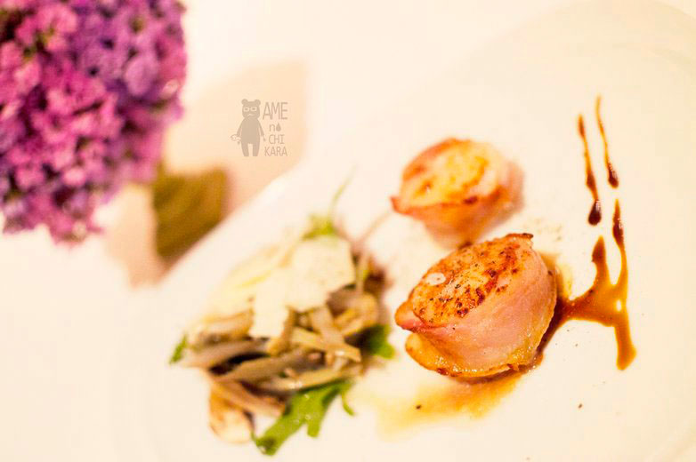 จานแรกของผมเป็นหอยเชลล์พันแฮมที่ทำจากเนื้อแก้มหมู (Guanciale ham)