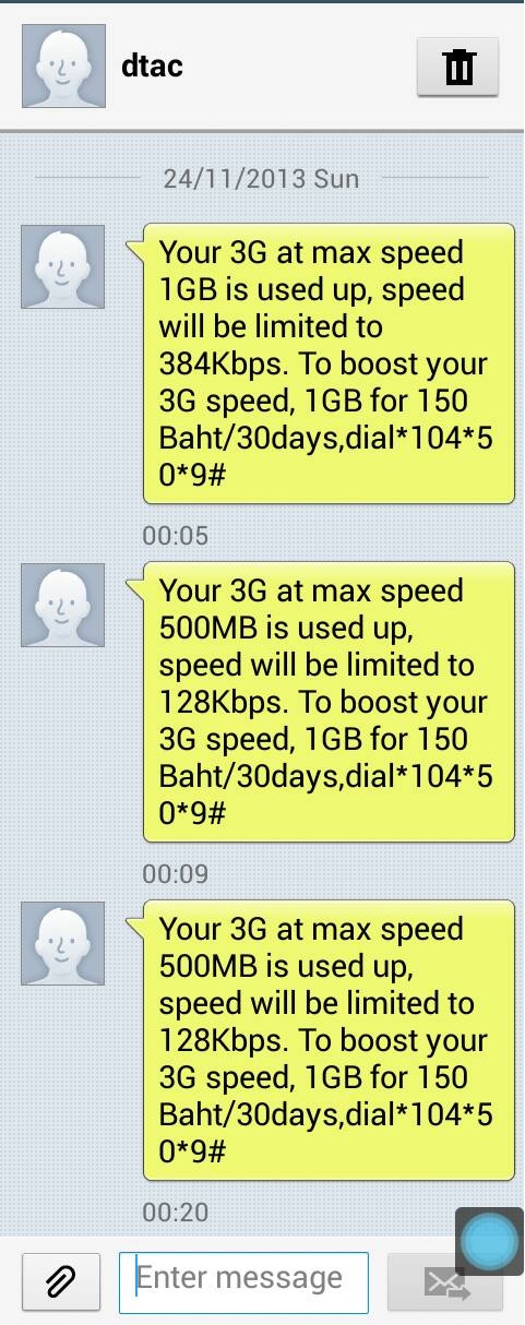 ผมใช้โปรอันลิมิต 199 บาท 3G สูงสุด 500m พอใช้เกินบริษัทคุณจะเจ๊งหรือไง ถึงต้องกระหน่ำส่งขนาดนี้ ส่ง sms มาแทบทุกวัน และเมื่อคืนส่งมาทีเดียว 3 ข้อความรวด ช่วงระหว่างเที่ยงคืน บริษัทคุณเป็นไรมากรึเปล่าครับ ไม่เกรงใจคนจะหลับจะนอนบ้าง