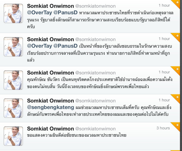 นายกยิ่งลักษณ์ ไม่ได้เป็นฆาตกรมือเปื้อนเลือดเหมือนคุณ เพราะไม่ได้เป็นนายกแล้ว เสียใจด้วยที่อยากให้นายกยิ่งลักษณ์ลงมือปราบม๊อบกบฏใช้ความรุนแรง เพื่อเพิ่มความชอบธรรมในการขยายม๊อบ เสียใจด้วยที่ต้องผิดหวั