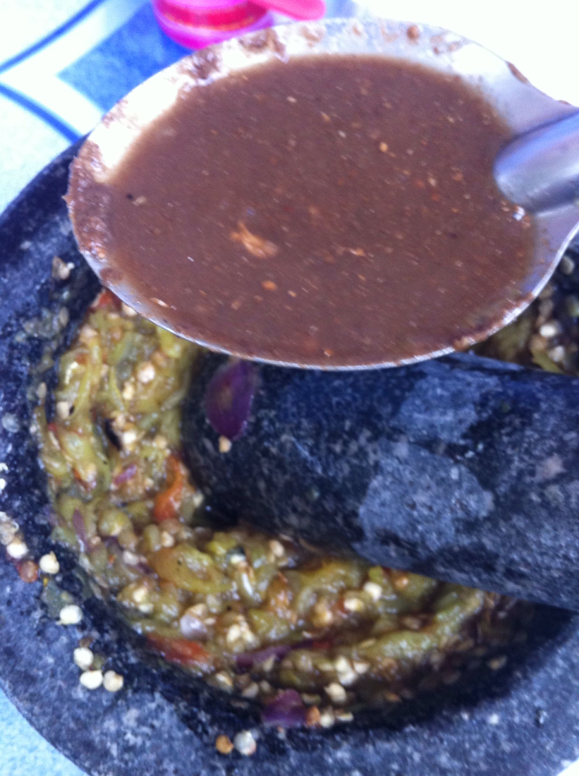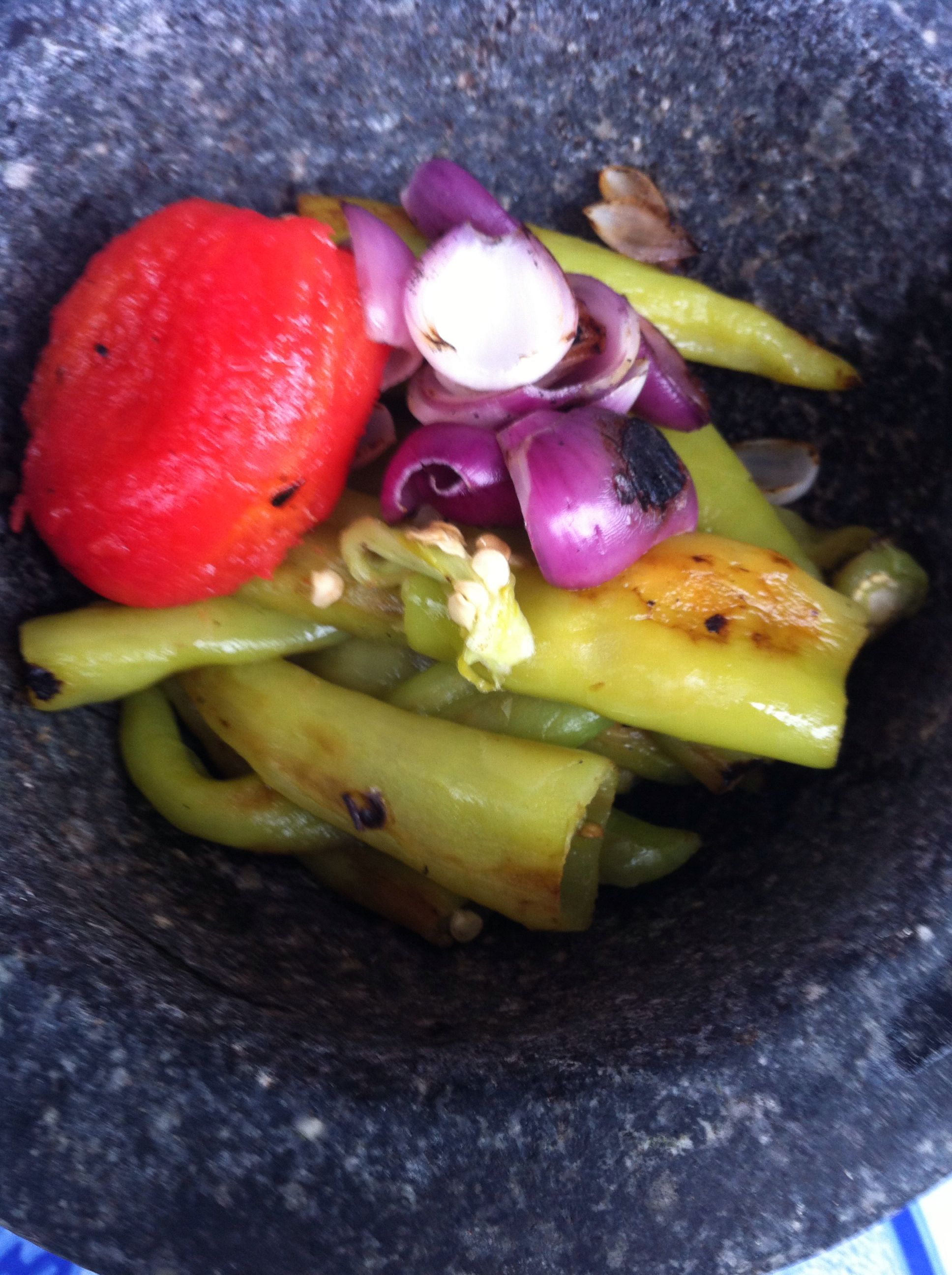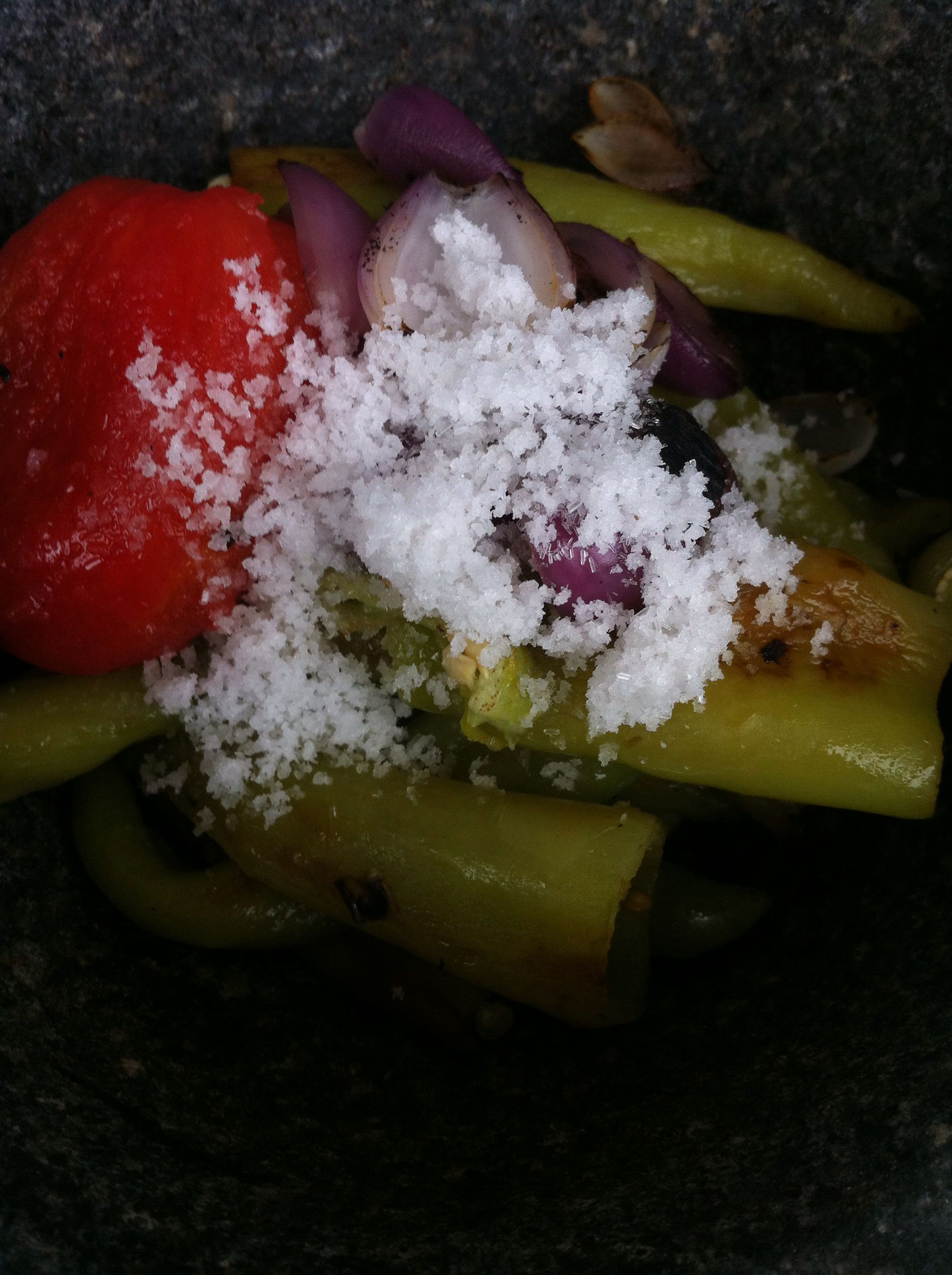 แกะเปลือกของพริกหยวกและมะเขือเทศออก ทิ้งลงในครกโลดดด
