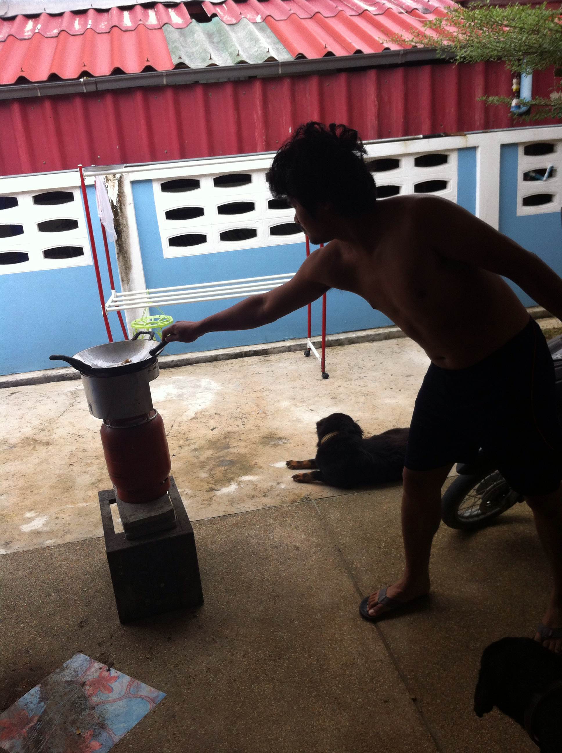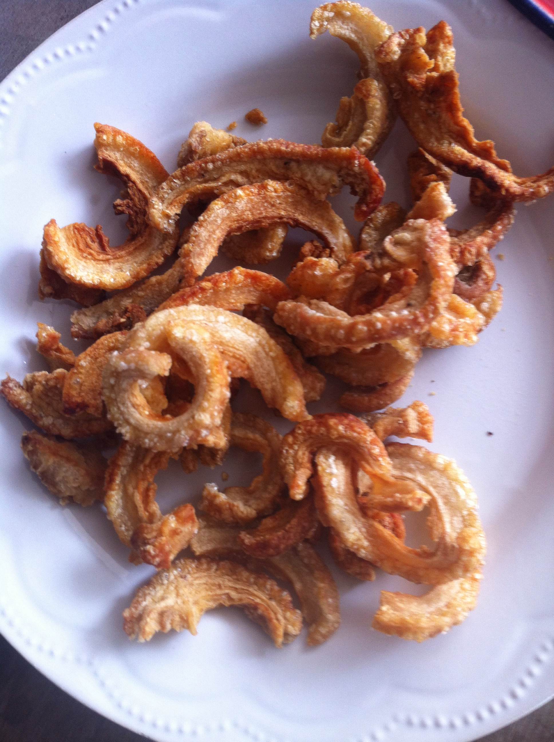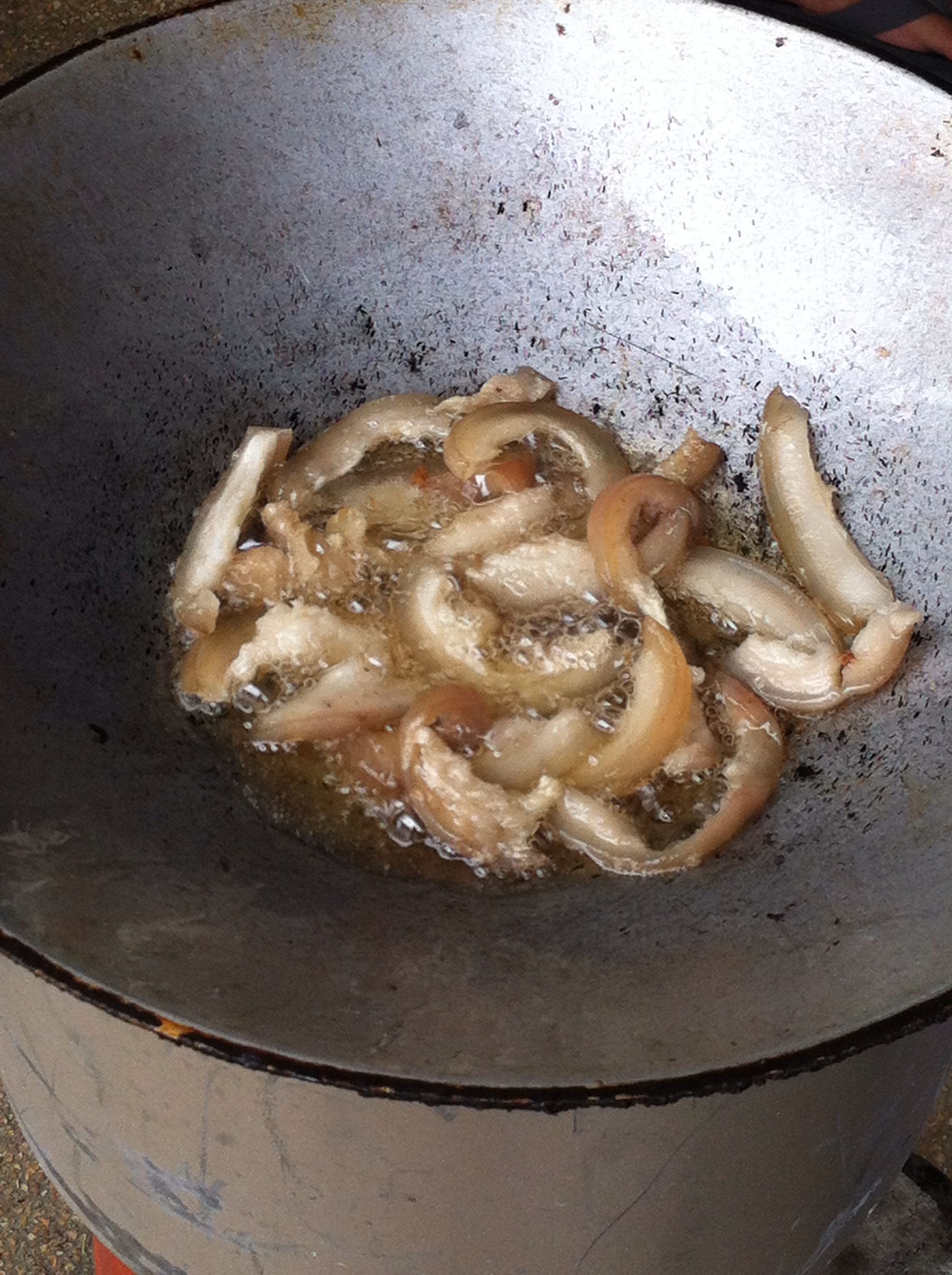 จัดการตั้งกะทะ เทน้ำมัน แล้วก็หย่อนหนังหมูลงไป