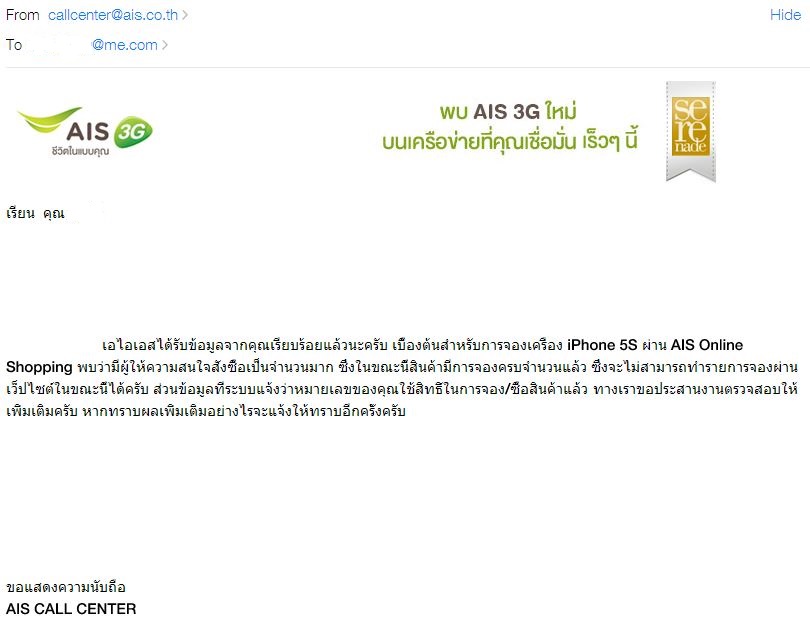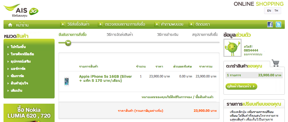 เมื่อวันที่ 13 พ.ย. 56 ผมได้ทำรายการสั่งซื้อ iPhone 5s ผ่านทาง Online Shopping ทำขั้นตอนไปถึงกดปุ่ม ผ่อน 0% หลังจากนั้นมีการสรุป แล้วมี Popup ขึ้นว่าประมาณว่า ถ้าท่านยืนยันการทำรายการแล้วจะไม่สามารถแก้ไขได้อีก ผมกด ยืนยัน ไป ต่อจากนั้นมีข้อความตัวสีแดงว่า “ขออภัยค่ะ สินค้าได้ถูกจองหรือชำหน่ายหมดแล้ว ขึ้นมาตรงกลางจอ แต่ด้านล่างเป็นรายการสรุปการสั่งซื้อ จากนั้นก็กดอะไรไม่ได้ จึงปิดหน้าต่างไปแล้ว เพื่อที่จะทำการซื้ออีกครั้ง แต่ครั้งนี้ผมไม่สามารถทำรายการได้ ระบบแจ้งว่า เบอร์ของผมได้ถูกใช้สิทธิ์ไปแล้ว (ตามรูปที่แนบ)