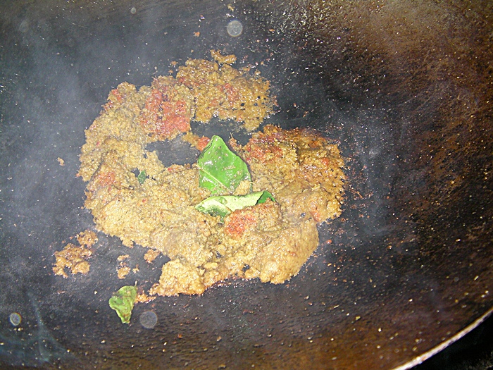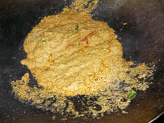 เอาพริกแกงมาผัดกับกะทิจนพริกแกงสุกและเริ่มแตกมัน
