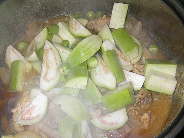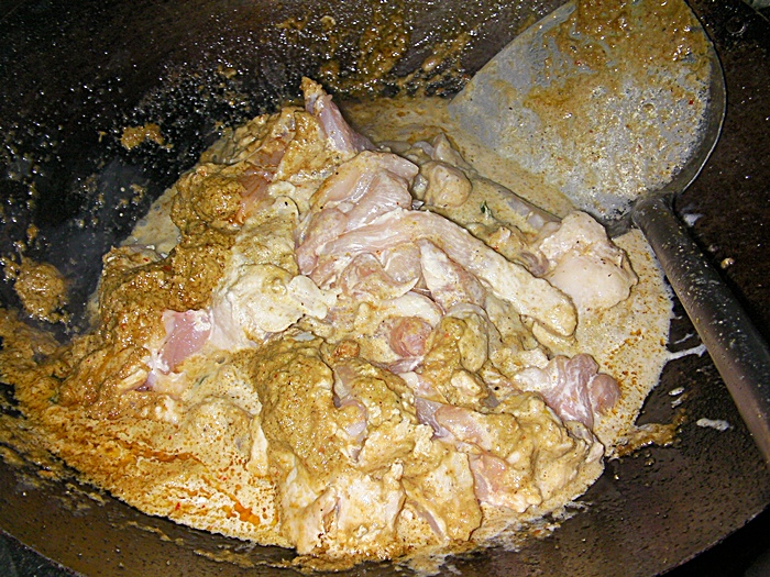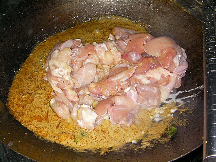 ก็ใส่เนื้อไก่ลงไปคลุกเคล้าให้เข้ากัน