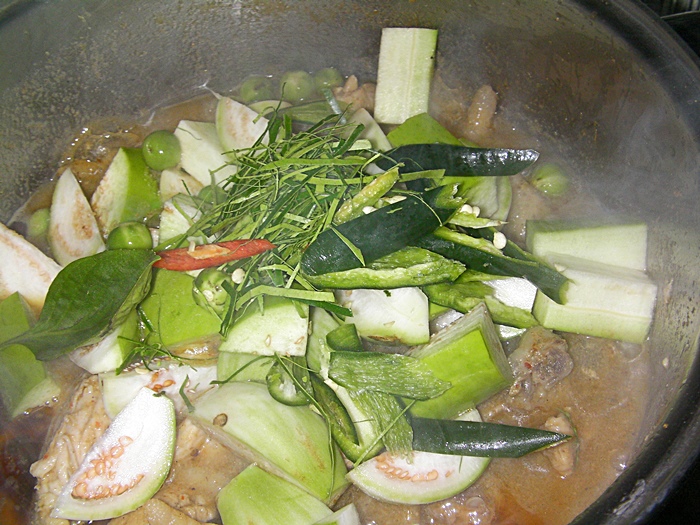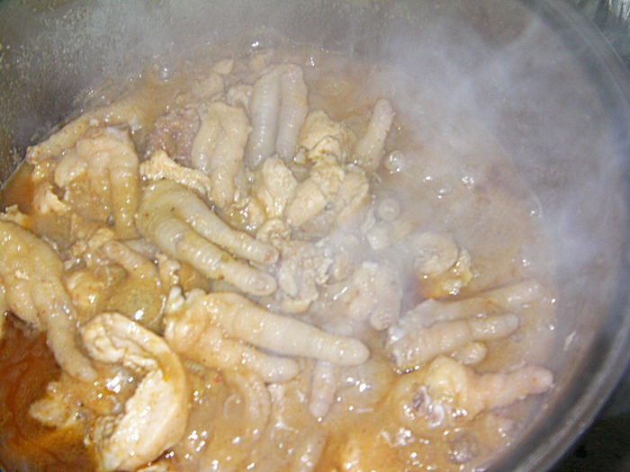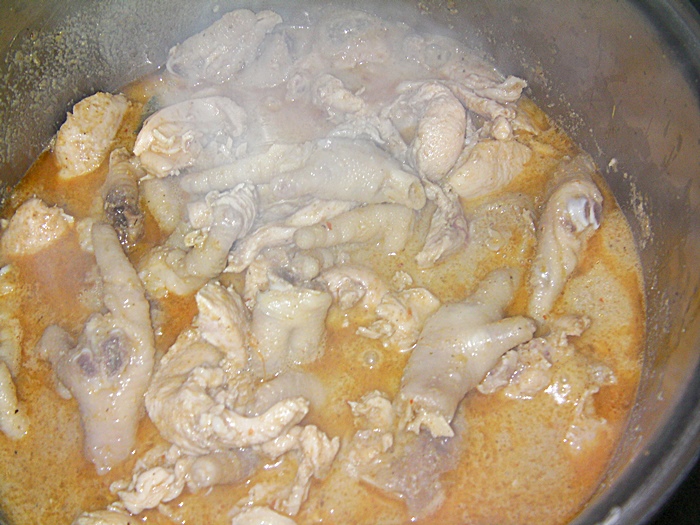แล้วก็เริ่มปรุงรสใส่น้ำตาบปี๊บน้ำปลาลงไป ส่วนผมจะเอา ตรีนไก่ไปต้มไว้กะหางกะทิในหม้อก่อนครับ