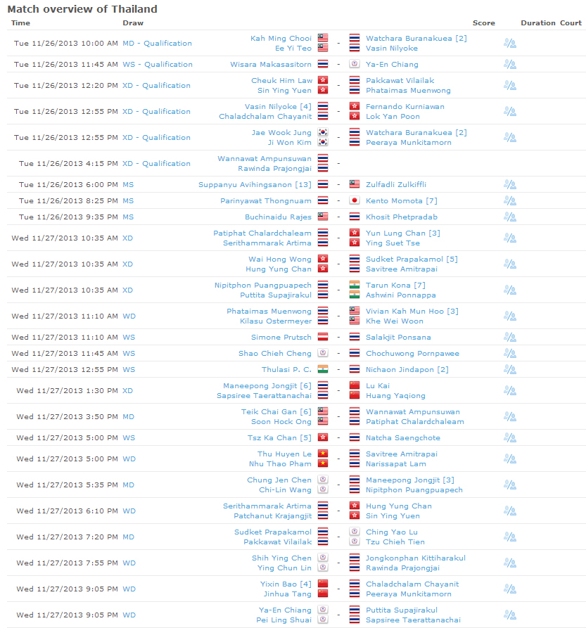 โปรแกรมนักแบดมินตันไทยใน Kumpoo Macau Open Badminton Grand Prix Gold 2013 ทั้งวันอังคารและวันพุธ