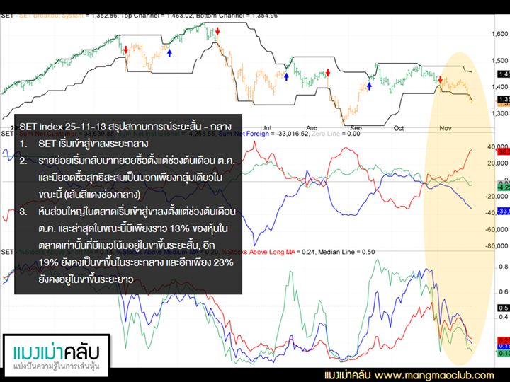 Update สภาพวะตลาดล่าสุดวันจันทร์ที่ 25-11-13 : SET Index เข้าสู่ขาลงในระยะกลางแล้วนะครับ! (จริงๆหลุดแนวรับมาได้สัก 2-3 วันแล้ว)