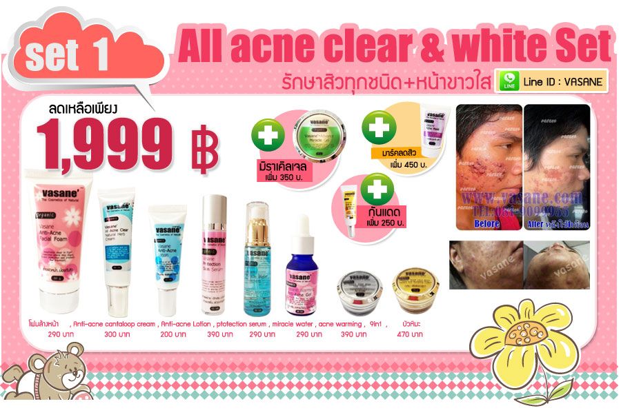 (ตัวล้างหน้า กะแต้มหัวสิวไม่มีในรูป เพราะทิ้งขวดไปแล้ว) ทายาหน้าเกลี้ยงดีจริงๆค่ะ หน้าเป็นสีชมพูเลย แต่พออ่านตามกระทู้ทั้งหลายก็บอกว่าใส่สาร เวลาไปซื้อยาก็นานมากขนาดไม่ได้ไปตรวจนะ ซึ่งเราว่าข้อนี้ไม่ดีเลย เพราะหมอไม่ได้ดูหน้าเรา แล้วจะรู้ได้ยังไงว่าหน้าเราดีหรือว่าแย่ แต่พอหน้าเราหายก็เลิกใช้ พอเลิกทา สิวก็มาอีก เราก็หยุดยาพวกนี้ไปซักพักจนมันขึ้นมาจนทนไม่ไหว ไปหาที่ที่ 2 คือ บางกอกครอสเมท แถวบางปะกอก (ร้านเขียวๆ เราไม่ได้ถ่ายรูปเก็บไว้) ที่นี่ขายคอร์สค่ะ ซื้อมันทุกอย่าง หมดไปก็เยอะ ไปนอนเอาเอาไรทาๆหน้า เครื่องอะไรต่อมิอะไรขูดๆถูๆ เออ มันดีแฮะ ชอบๆ แอร์เย็น หน้าเนียน ใส เราไปอาทิตย์ละ 2 วัน แต่ก็อีกแหละ หมดเป็น 10,000 กับการซื้อคอร์ส (ยังดีที่ไม่ได้ออกเงินเอง) พอไปทำหน้าก็ต้องซื้อยาทาอีกทุกรอบ เอาเป็นว่าเสียเงินทุกครั้ง เพราะฉะนั้นไม่ไปหาแล้วดีกว่า หลังจากนั้นก็ปล่อยไปตามเวรตามกรรม จนมีเมื่อกลางปี 56 ก็ลองซื้อยาพวกร้านขายยามาทา รักษาเอง ก็ไม่ได้ดังใจ จนคนที่ทำงานแนะนำ ยี่ห้อ วาซาเน่ (ครีมเน็ต)