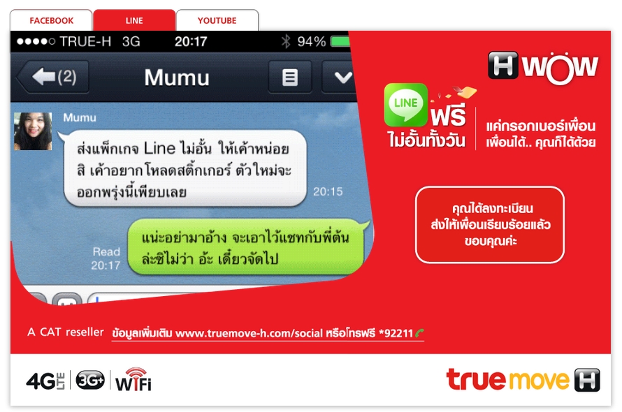 TrueMove H เขามีโปรโมชั่นให้เราส่งแพ็คเกจ LINE, Facebook, Youtube หาเพื่อนที่ใช้ทรูด้วยกัน (ทั้ง Truemove, TrueMove H) ส่งให้เพื่อนได้ใช้ฟรีไม่อั้น 1 วัน แล้วถ้าเพื่อนตอบรับ เราก็จะมีสิทธิซื้อแพ็คเกจนั้นๆ ในราคา 50%
