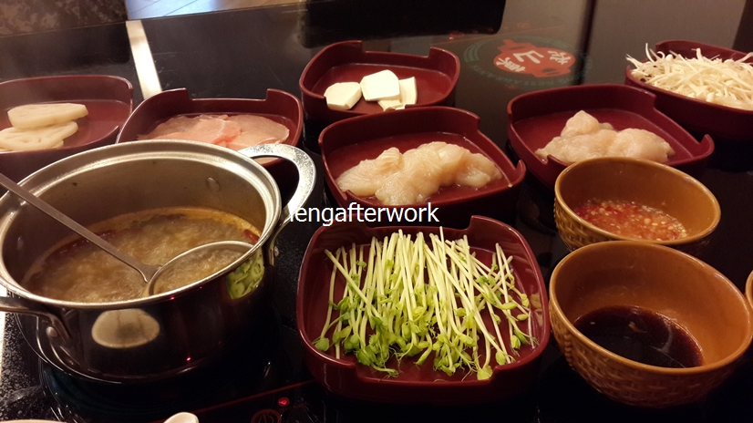เริ่มทาน น้ำซุปมีให้เลือกหลายอย่าง เลือกแบบเสฉวน เผ็ดมาก ไม่เปรี้ยว อยากเปรี้ยวเอาน้ำจิ้มซีฟู้ดมาจิ้ม แซ่บเลย