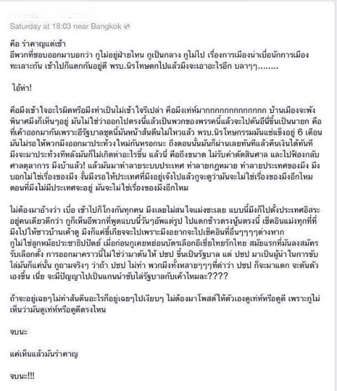 ผมมองแล้วว่ามันผิด ผมก้ไม่เอาด้วยแค่นั้น ผมก็กลายเป็นคนกลาง ไม่ฝักใฝ่ฝ่ายใด แล้วเสียงของผมไม่มีความหมายเหรอครับ ผมเชื่อว่าคนที่ไม่เห็นด้วยกับม๊อบนกหวีดเข้ายึด มีจำนวนเยอะอยู่นะครับ ฟังเสียงพวกผมบ้างก็ดีนะครับ อย่ามั่นใจดูถูกเสียงคนอื่นให้เกินไปครับ ไม่เอาม๊อบแบบที่ทำอยู่ครับ ประเทศอาจจะพังเพราะตระกูลมัน ใช้เวลาเยอะกว่า ตอนนี้ประเทศจะพังวันนี้พรุ่งนี้เพราะม๊อบครับ