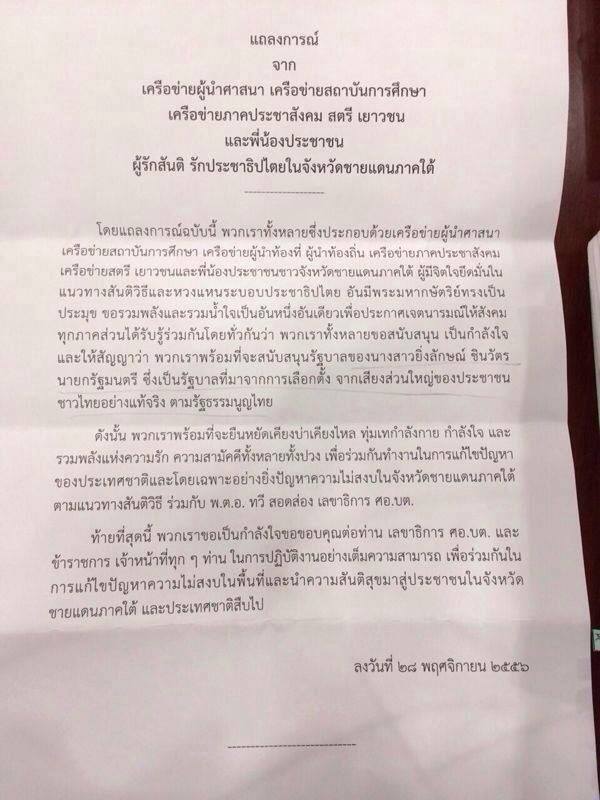 ผู้นำศาสนา 5 จังหวัดชายแดนภาคใต้ ยื่นแถลงการณ์สนับสนุน "นายกฯ ยิ่งลักษณ์" ให้บริหารต่อไป