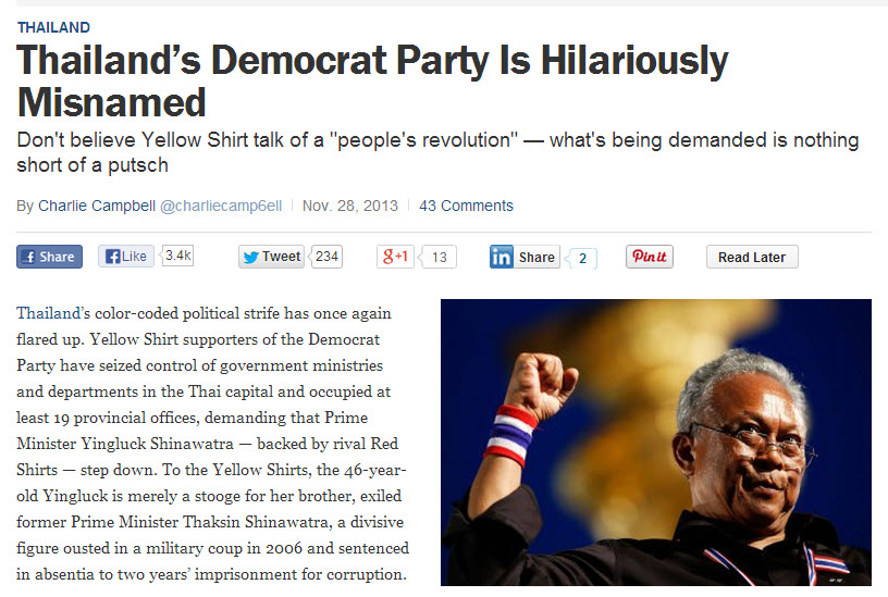 เมื่อวานโดน Bloomberg วันนี้ TIME จัดให้อีกดอกครับ "Thailand’s Democrat Party Is Hilariously Misnamed" http://world.time.com/2013/11/28/thailands-democrat-party-is-hilariously-misnam