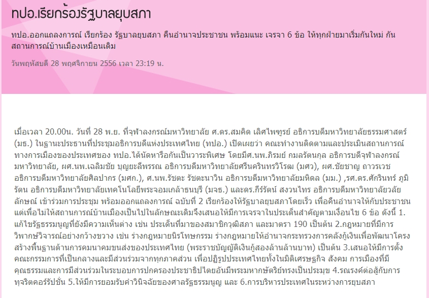 อธิการบดีมหาวิทยาลัยรามคำแหง ได้ออกแถลงการณ์เรียกร้องให้รัฐบาลยุบสภา