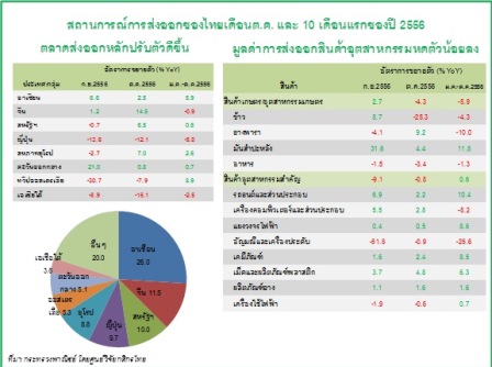 การส่งออกของไทยในเดือนต.ค.2556 มีมูลค่า 19,393.5 ล้านดอลลาร์ฯ เพิ่มขึ้นจากเดือนก่อนหน้าเล็กน้อย และชะลอการหดตัวมาที่ร้อยละ 0.7 (YoY) เมื่อเทียบกับช่วงเดียวกันปีก่อน โดยเป็นผลจากมูลค่าการส่งออกไปยังตลาดหลักที่ปรับตัวดีขึ้น โดยเฉพาะจีน สหภาพยุโรป และสหรัฐฯ สอดคล้องกับตลาดศักยภาพอื่นๆ ที่ยังสามารถรักษาอัตราการขยายตัวไว้ได้ ทั้ง อาเซียน และตะวันออกกลาง อย่างไรก็ดี การส่งออกไปยังญี่ปุ่นและเอเชียใต้ และทวีปออสเตรเลีย ยังคงหดตัว
