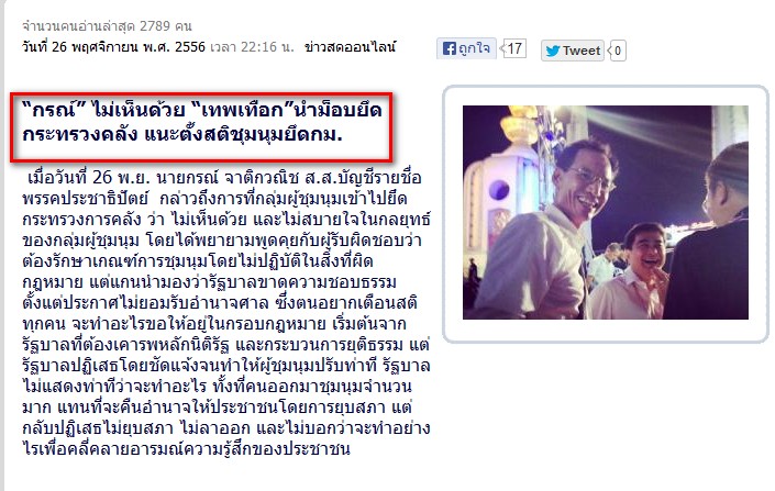 กรณีนายกรณ์ จาติกวณิช รองหัวหน้าพรรคประชาธิปัตย์ แสดงท่าทีต่อสาธารณะไม่เห็นด้วยกับการเข้ายึดกระทรวงการคลัง และสำนักงบประมาณ ว่า นายกรณ์ มีสิทธิ์ 100% ที่จะไม่เห็นด้วย แต่ผู้ชุมนุมก็มีสิทธิ์ดำเนินการใดๆ ที่จำเป็นจะให้การต่อสู้สำเร็จในการต่อสู้กับระบอบทักษิณ เพื่อให้บรรลุชัยชนะของประชาชน ซึ่ง