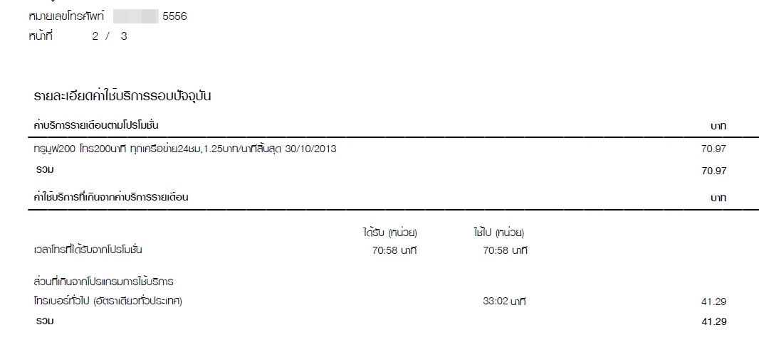 บิลใบที่ 2 แจ้งว่า ได้รับจำนวนการโทร 70:58 นาที ใช้ไป 70:58 นาที