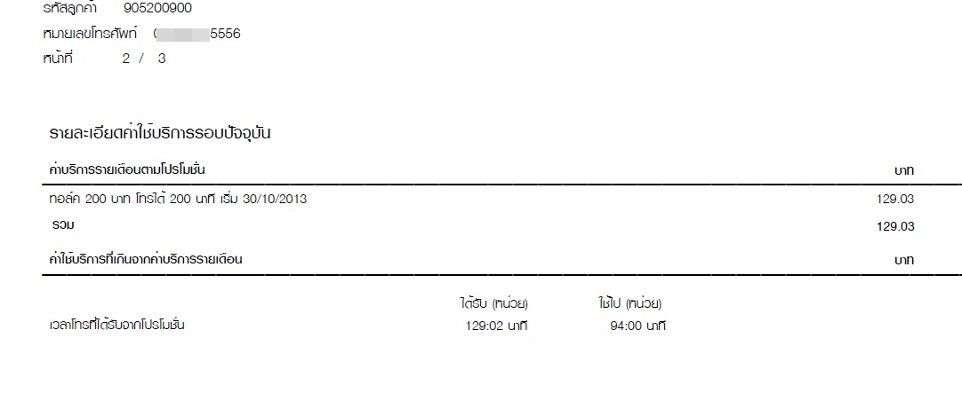 บิลใบแรกได้รับจำนวนการโทร 129.02 นาที ใช้ไป 94:00 นาที คงเหลือ 35.02 นาที