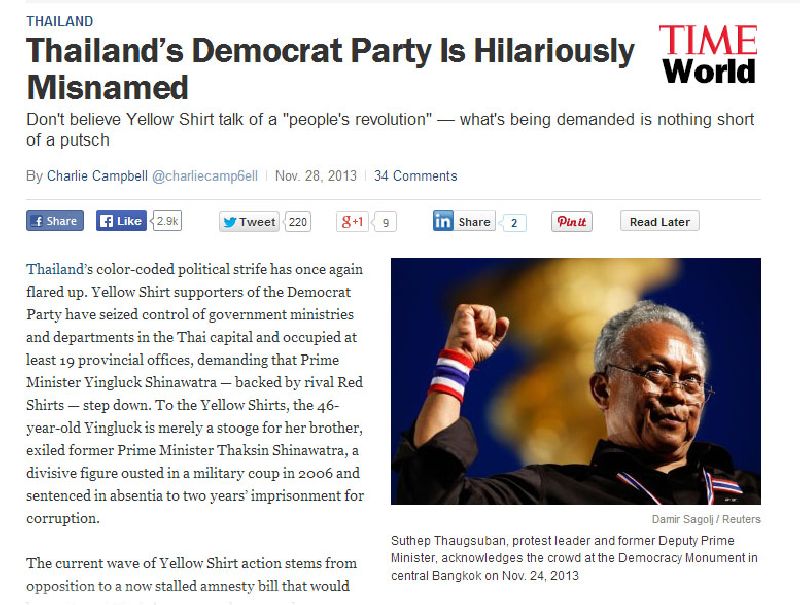 วันที่ 28 พ.ย. เว็บไซต์นิตยสารไทม์ ของสหรัฐอเมริกา เผยแพร่บทความเกี่ยวกับสถานการณ์การเมืองไทย หัวข้อเรื่อง "พรรคประชาธิปัตย์ของไทย ชื่อพรรคนี้ตั้งผิดอย่างฮา" (Thailand’s Democrat Party Is Hilariously Misnamed) พร้อมโปรยใจความว่า อย่าไปเชื่อการพูดถึง "ปฏิวัติประชาชน" ของกลุ่มเสื้อเหลือง - สิ่งที่เรียกร้องนั้นไม่ใช่เรื่องอื่นใดที่ต่างจากการยึดอำนาจ Don′t believe Yellow Shirt talk of a "people′s revolution" — what′s being demanded is nothing short of a putsch เขียนโดย ชาร์ลี แคมป์เบล