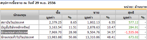 สรุปการซื้อขาย ณ วันที่ 29 พ.ย. 2556