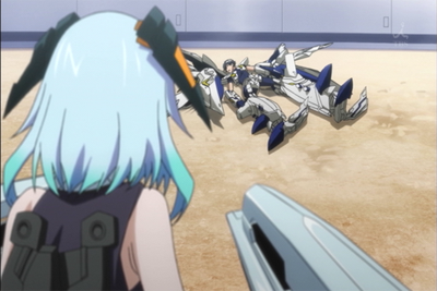 - IS ลึกลับเข้าจู่โจมใส่คันซาชิ แต่ประธานเข้ามาป้องกันเอาไว้ด้วยร่างกายของตนเองจนบาดเจ็บหนัก