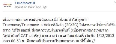เนื่องจากสถานการณ์ฉุกเฉินขณะนี้ ส่งผลทำให้ ลูกค้า Truemove/Truemove-h Voice&Data (2G/3G) ไม่สามารถใช้งานได้ชั่วคราว ได้ในขณะนี้ ส่งผลกระทบในบางพื้นที่ (เนื่องจากผลกระทบจากไฟฟ้าดับที่ CAT บางรัก)
