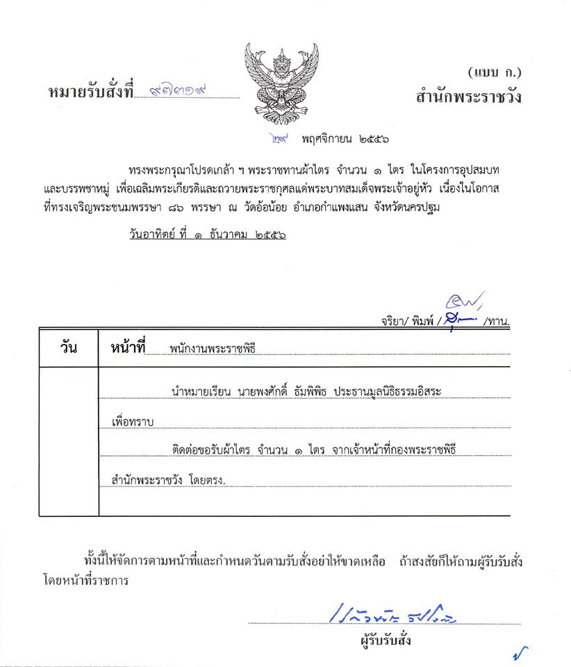 ร่วมอนุโมทนา ทรงพระกรุณาโปรดเกล้า ฯ พระราชทานผ้าไตร จำนวน ๑ ไตร วัดอ้อน้อย จังหวัดนครปฐม