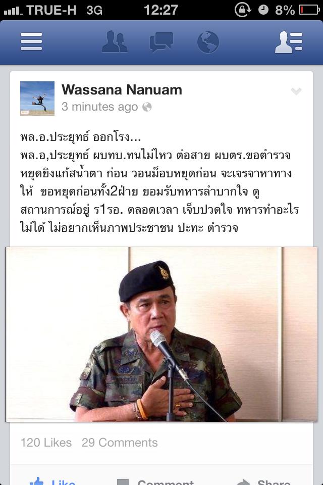 ผู้สื่อข่าวรายงานว่า เฟจบุ๊คของวาสนา นาน่วม ผู้สื่อข่าวสายทหารหนังสือพิมพ์บางกอกโพสต์ รายงานว่า พล.อ. ประยุทธ์ ผบ.ทบ.ทนไม่ไหว ต่อสาย ผบ.ตร.ขอตำรวจหยุดยิงแกสน้ำตาก่อน วอนม็อบหยุดก่อน จะเจรจาหาทางให้ โด