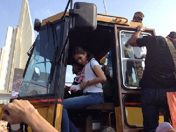 2 ธ.ค.56 ผู้สื่อข่าวรายงานว่า ที่เวทีราชดำเนิน ได้นำรถเทรเลอร์ จากผู้บริจาคใช้โค่น