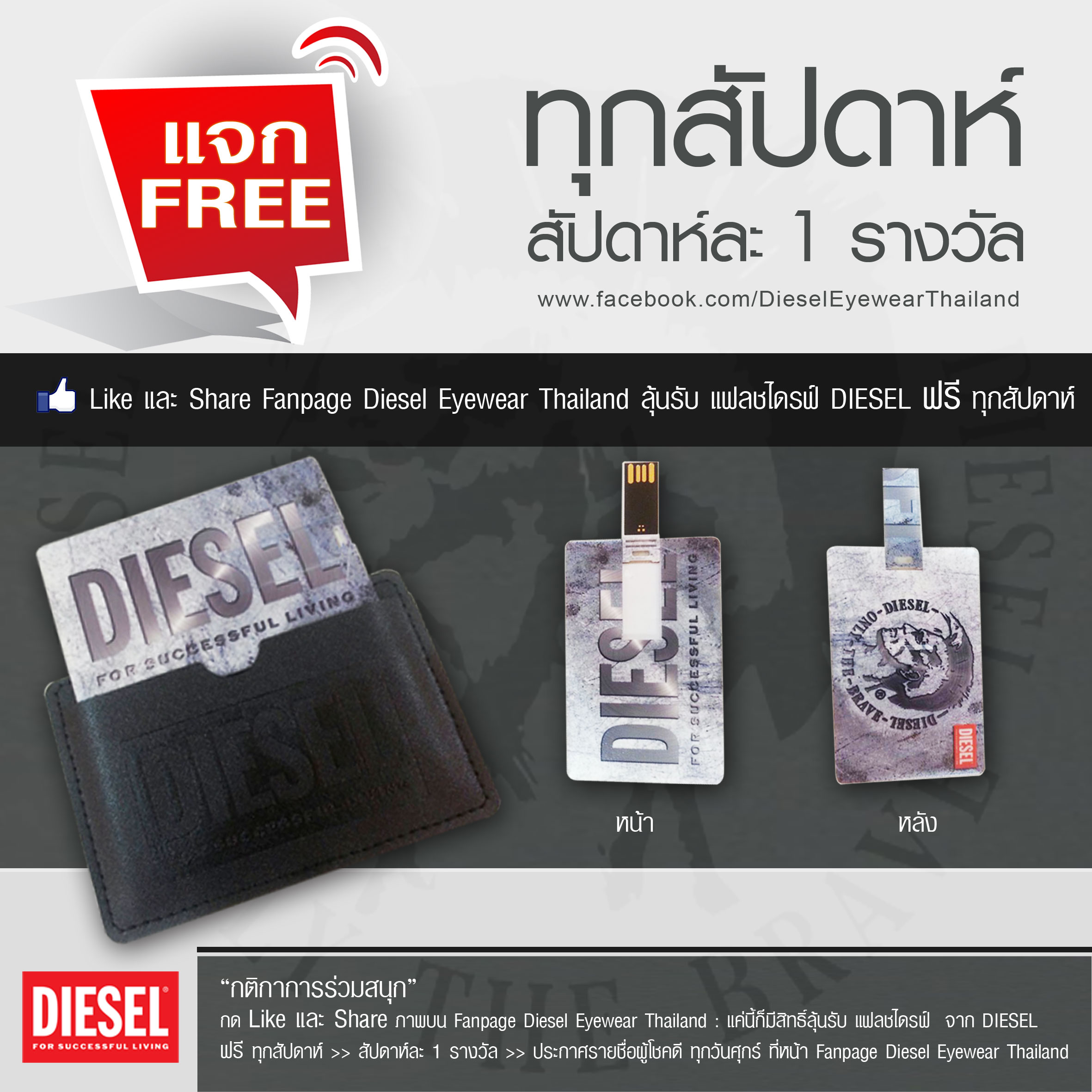 “กติกาการร่วมสนุก” กด Like และ Share ภาพบน Fanpage Diesel Eyewear Thailand : แค่นี้ก็มีสิทธิ์ลุ้นรับ แฟลชไดรฟ์ จาก DIESEL
