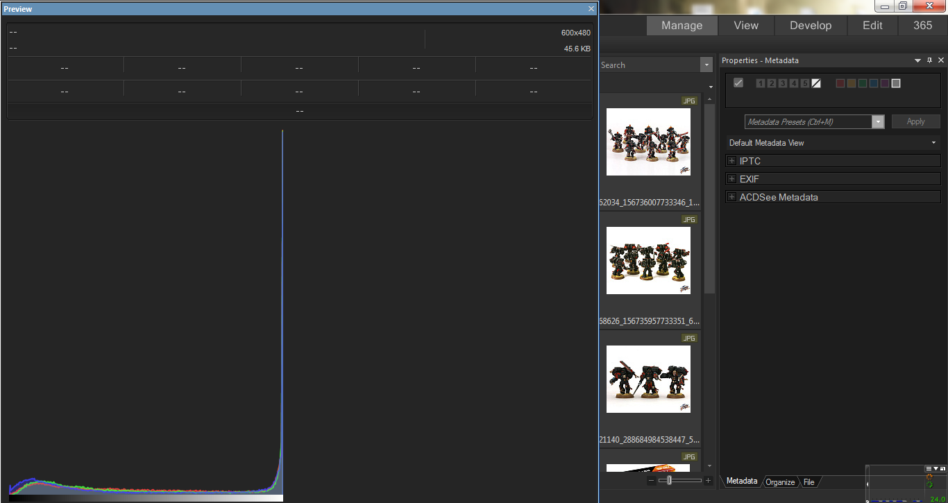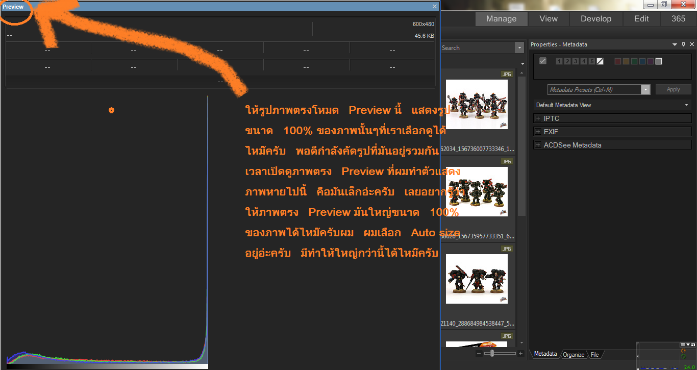 คือพอดีว่าผมดันเผลอไปกดคลิก ที่ทำให้รูป เวลาเรา Preview แล้วมีรูปขึ้นมา ตรงโหมด manage หน่ะครับ แล้วจะทำให้รูปตรงหน้าต่าง Preview ปรากฏกลับขึ้นมาเหมือนเดิมได้ยังไงครับ ตามรูปหน้าต่าง Preview อยู่ด้านซ้ายมืออ่ะครับ ที่มีรูป คลื่นฟ้าๆอ่ะ แต่พอดีว่าผมไปกดไรไม่รู้ ทำให้ตัวแสดงภาพมันหาย ยังไงผู้รู้ช่วยตอบทีครับ ได้โปรดดด T^T ขอถามอีกครับว่า มีวิธีทำให้ภาพที่เรา Preview ออกมาแล้วภาพมันใหญ่ได้ไหม๊ครับ พอดีผมกำลังคัดรูป จะเอารูปแยกออกจากภาพที่ถ่ายรวมกันหน่ะครับ เวลาเลือกรูปจะติ๊กรูป พอตอนมันแสดงภาพ (ตอนนี้ผมทำตัวแสดงภาพหายไปแล้ว เหลือแต่คลื่นๆสีฟ้าๆ) ทำให้ภาพที่เราดูแบบ Preview ใหญ่กว่าตัวเลือกที่มันมีให้เลือกได้ไหม๊ครับ พอดีผมขยายจอภาพตรงโหมด Preview ให้มันใหญ่ๆ ดังที่เห็นในรูปแหละครับ แต่เหมือนว่าภาพมันจะไม่ใหญ่ตามหน้าต่างที่ผมจะขยายซักเท่าไหร่ ทำได้ดีก็แค่เลือก Auto size อ่ะครับ มีวิธีทำให้ภาพมันใหญ่โดยที่เราไม่ต้องไปเอาเม้าส์เลื่อนซูมดูได้ไหม๊ครับ แบบเปิดตรง Preview มาให้ภาพมันแสดงขนาดได้ 100% ของภาพเลยอ่ะครับ พอจะทำได้ไหม๊ครับผม ขอบคุณมากครับ และอีกคำถามครับ พื้นหลังของ ACDSEE PRO 7 นี้ เปลี่ยนจากสีดำเป็นสีเทาได้ไหม๊ครับ พอดีสีดำแล้วมันดูยากอ่ะครับ พื้นหลังของโปรแกรมตอนนี้ที่ผมใช้มันออกสีดำๆอ่ะครับ อยากให้เป็นสีที่อ่อนกว่านี้ เช่นสีเทาครับ เหมือน ACDSEE 12 อ่ะครับ ดูแล้วสบายตาดีครับ รบกวนท่านๆทั้งหลาย ช่วยตอบปัญหาและคำถามทั้ง 3 ข้อของผมด้วยนะครับผม ได้โปรดเถอะครับ ขอบคุณครับ T^T