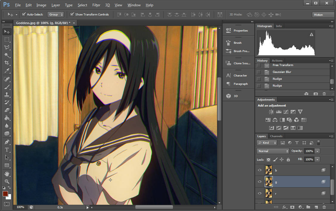 แต่วิธีนี้ บางครั้งมันเห็นไม่ชัด จะมีอีกวิธีหนึ่งคือแยก channel RGB ของภาพ แล้วเอาแต่ละ channel มาย่อ ขยาย เลื่อนซ้ายเลื่อนขวา ให้แต่ละ channel อยู่ในตำแหน่งที่ไม่ตรงกันเล็กน้อย วิธีนี้จะปรับยากนึดหน่อย แต่ว่าจะคุมภาพให้ออกมาตามที่ต้องการได้หลากหลายกว่าครับ