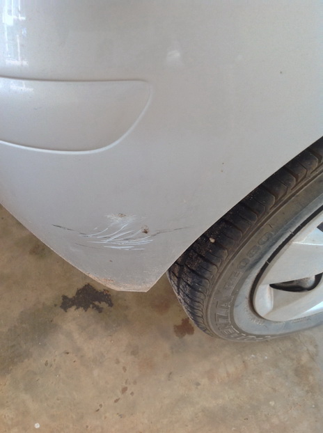 เนื่องจากขับน้องพารวย ไป เที่ยวแฟชั่นสักหน่อย วันหยุด .. และเมื่อถอยหลังจอด ที่กั้นล้อมันหายไป ทำให้กะไม่ถูก เพราะปกติชินกับการให้มันชนกับที่กั้นล้อพอดี เลยใส่เต็มที่ ปรากฎว่า "ชนเสา" คะพี่
