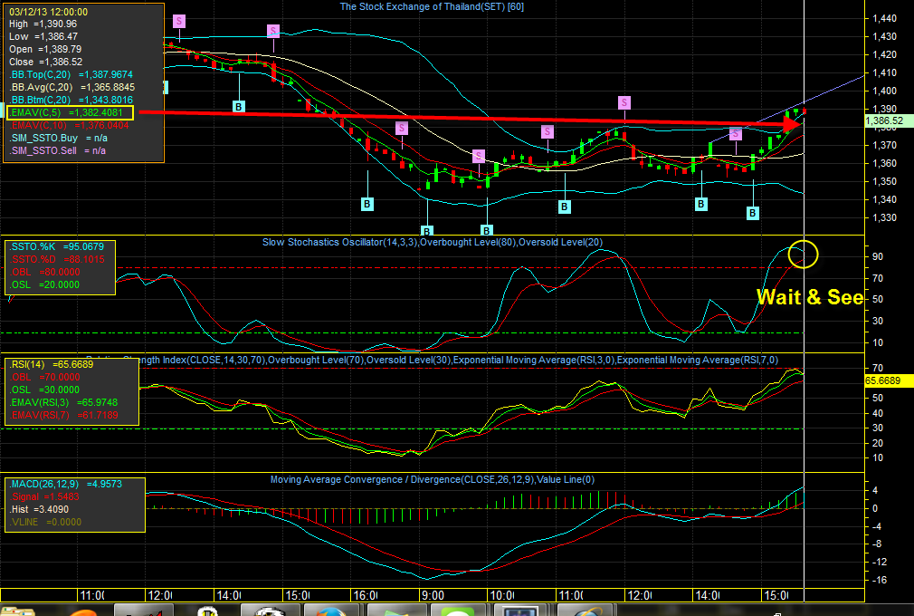 จากตรงนี้ จะสังเกตเหนว่า เครื่องมือทาง เทคนิคฟ้องว่า 1. EMA 5 วัน ได้จัด EMA 25 วันแล้ว 2. macd กำลังจะตัดลง 3. modify sto ตัดลง แล้ว 4.หลุด เส้นUPTREND LINE แล้ว นะครับ ซึ่งทั้งหมดคิดว่า น่าจะกดดั