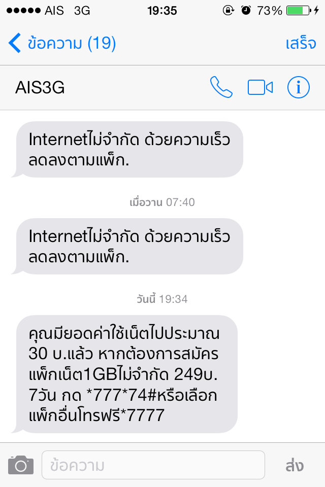 ของผมมีข้อความสุดท้ายจากAISว่า คืนนี้หลังเที่ยงคืนคุณจะอัพเกรดเป็นAIS 3Gใหม่ ด้วยโปรโมชั่นเดิม กรุณาเปิดเครื่องตลอดเวลาและใช้ซิมเดิมเครื่องเดิม ข้อควรรู้โทร*985ฟรี วันที่ 27เมษายน 9:24น.จนตอนนี้วันที่