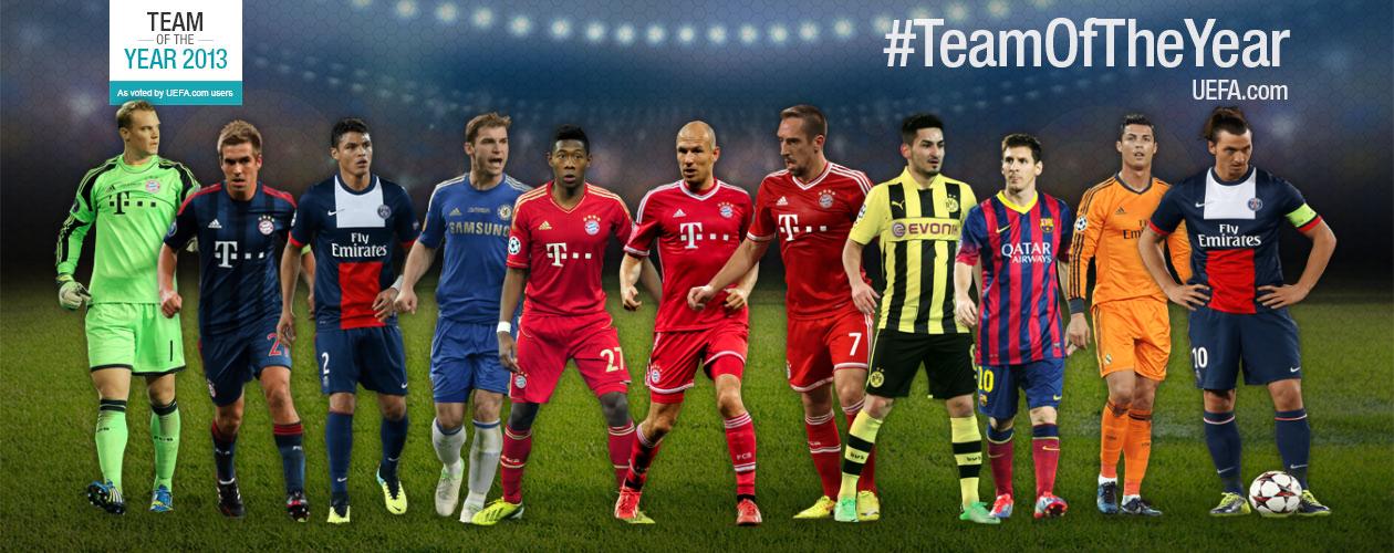 TEAM OF THE YEAR 2014 AS VOTED BY UEFA.COM USERS จาก NOMINEES ได้แก่ Goalkeepers Defenders Midfielders Forwards http://en.toty.uefa.com/