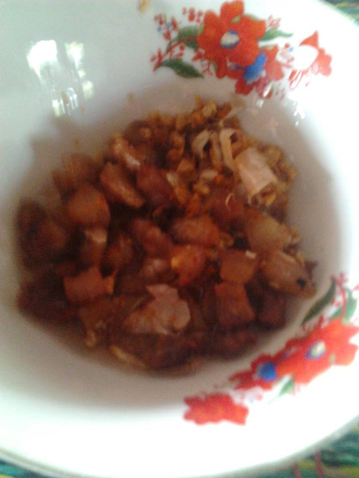 เจียวหมูกับกระเทียมให้หอม  จริง ๆ ส่วนใหญ่เค้าจะใช้กากหมูนะคะ แต่ จขกท ไปตลาดวายแล้ว