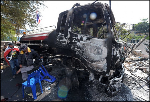 @ ผู้ประท้วงต่อต้านรัฐบาล ยืนใกล้กับซากรถตำรวจที่ถูกเผา บริเวณทำเนียบรัฐบาล เมื่อวันที่ 3 ธันวาคม 2556
