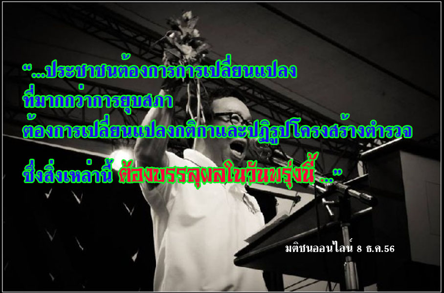 “ในวันพรุ่งนี้เราจะไม่ประมาท สำหรับทีมที่จะต้องปฏิบัติการในการเผชิญหน้ากับความรุนแรง ซึ่งจะต้องเตรียมคนที่มีประสบการณ์ และต้องมีอุปกรณ์ป้องกันครบครัน การเข้าไปในทำเนียบ ถือเป็นการแสดงออกทางสัญลักษณ์ที่สำคัญว่า ประชาชนไม่ต้องการระบอบทักษิณ รัฐบาลยิ่งลักษณ์ และสภาทาส แต่ประชาชนต้องการการเปลี่ยนแปลงที่มากกว่าการยุบสภา ต้องการเปลี่ยนแปลงกติกา และปฏิรูปโครงสร้างตำรวจ ซึ่งสิ่งเหล่านี้ต้องบรรลุผลในวันพรุ่งนี้ เมื่อถึงแล้วจะเข้าข้างในทำเนียบหรือไม่อย่างไรนั้น ต้องประเมินสถานการณ์อีกครั้งหนึ่ง”นายสาทิตย์ กล่าว. .."