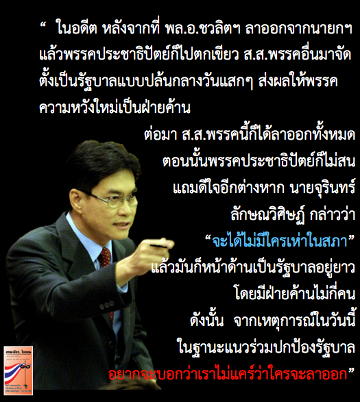 ดังนั้น จากเหตุการณ์ในวันนี้ ในฐานะแนวร่วมปกป้องรัฐบาล อยากจะบอกว่าเราไม่แคร์ว่าใครจะลาออก