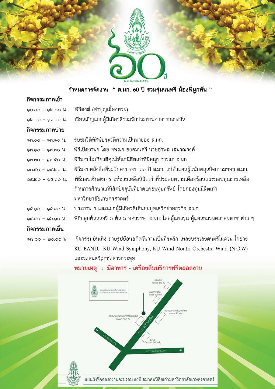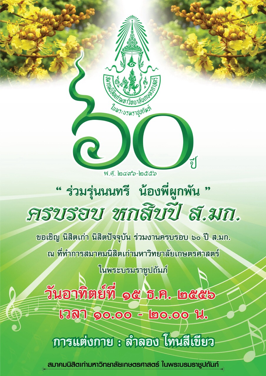 ขอเรียนเชิญนิสิตเก่า นิสิตปัจจุบัน มหาวิทยาลัยเกษตรศาสตร์ ทุกวิทยาเขต เข้าร่วมกิจกรรม ครบรอบหกสิบปี ของ สมาคมนิสิตเก่ามหาวิทยาลัยเกษตรศาสตร์ ในพระบรมราชูปถัมภ์ ภายใต้ชื่องาน “รวมรุ่นนนทรี น้องพี่ผูกพัน” ร่วมกิจกรรมปลูกต้นนนทรีอันเป็นต้นไม้ประจำมหาวิทยาลัย, ชมวีดีทัศน์ ประวัติความเป็นมา ส.มก., ร่วมพิธีมอบทุนการศึกษาแก่นิสิตปัจจุบัน, พิธีมอบโล่เกียรติคุณให้แก่นิสิตเก่าที่ทำคุณประโยชน์ชมบู้ทเครือข่าย ของ สมาชิก ส.มก. ตลอดจนกิจกรรมบันเทิงมากมาย อาทิ ดนตรีวงรวมดาวกระจุย วงดนตรี เคยู แบน และ เคยู วิน ซิมโฟนี่ ที่คว้ารางวัลอันดับหกในการแข่งขันระดับโลก และอันดับหนึ่งในเอเซีย ร่วมสนับสนุนกิจกรรมของ ส.มก.ด้วยการสั่งจองหนังสือที่ระลึกครบรอบหกสิบปี ส.มก. ที่ลูกนนทรีทุกคนควรมีไว้ รายได้ใช้เป็นทุนทรัพย์ในการปรับปรุงอาคารที่ทำการ ส.มก. อาหาร เครื่องดื่ม ฟรีตลอดงาน , แต่งกาย ลำลอง โทนสีเขียว วันอาทิตย์ที่ 15 ธันวาคม 2556 ตั้งแต่ 10.00 – 20.00 น. ณ ที่ทำการ สมาคมนิสิตเก่ามหาวิทยาลัยเกษตรศาสตร์ ในพระบรมราชูปถัมภ์ เลขที่ 50 ถนนพหลโยธิน แขวงลาดยาว เขตจตุจักร กรุงเทพฯ ( ก่อนถึงกรมป่าไม้) โทร 02 579 -2419, 02 -579-3485