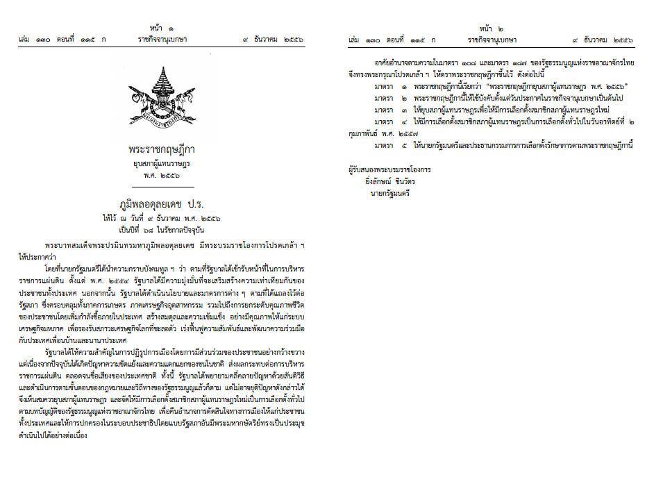 พระบาทสมเด็จพระเจ้าอยู่หัวทรงโปรดเกล้าฯ พรฎ.ยุบสภา และได้ประกาศลงในราชกิจจานุเบกษาเรียบร้อยแล้ว กำหนดวันเลือกตั้งใหม่ 2 กุมภาพันธ์ 2557