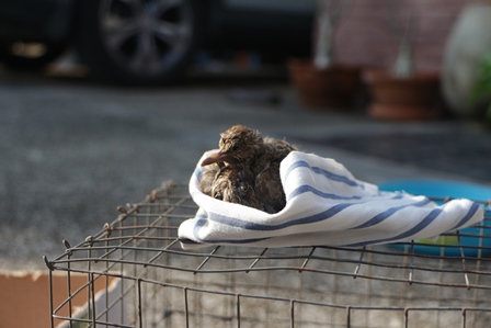 แต่ตัวนี้มันไม่ยอมอ้าปากเลย ยอมลำบากอีกหลายวันเพราะเกือบขับรถทับมันเนี่ยแหละ เรื่องของเรื่องคงเพราะมันตกมาจากรัง (ไม่รู้จากไหน) แล้วเดินเตาะแตะ ข้ามมาครึ่งถนนแล้ว แถมมีนกเอี้ยงตามจิกหรือตามดูไม่รู้ ไอ้ที่เห็นเพราะเจ้านกเอี้ยงนี่แหละ มันตัวใหญ่เลยเห็นชัด ส่วนเจ้าตัวเล็กดันอุบอยู่กลางถนน พอรถเลยไปจอดเพื่อลงไปจับ ดันมีลุ้นกับรถซาเล้งที่ตามหลังมาเกือบจะทับอีกที เพราะเขาก็ไม่เห็นเหมือนกัน