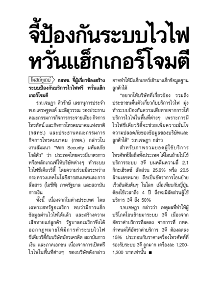 08 ธันวาคม 2556 กสทช.เตรียมหามาตราการระบบ WIFI Security โดยร่วมมือกับ ICT ภาครัฐและ สถาบัญทางการเงิน
