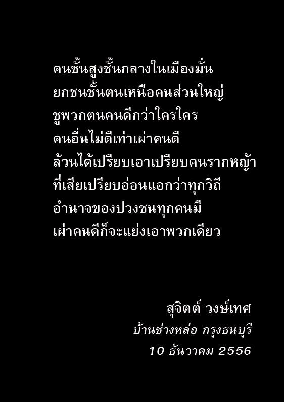 จะชุมนุม ทำไม ไร้สาระ พวกกักขฬะ ทั้งหลาย โปรดได้คิด พาประเทศ ป่นปี้ วิปริต ทั้งชีวิต เคยคิดดี มีบ้างไหม ชาติย่อยยับ อัปรา แล้วหนานี่ พวก:) ผู้ดีดิบ ทำ:) ปากก็ว่า รักชาติ รักวอดวาย ประเทศไทย ตายดิ้น สิ