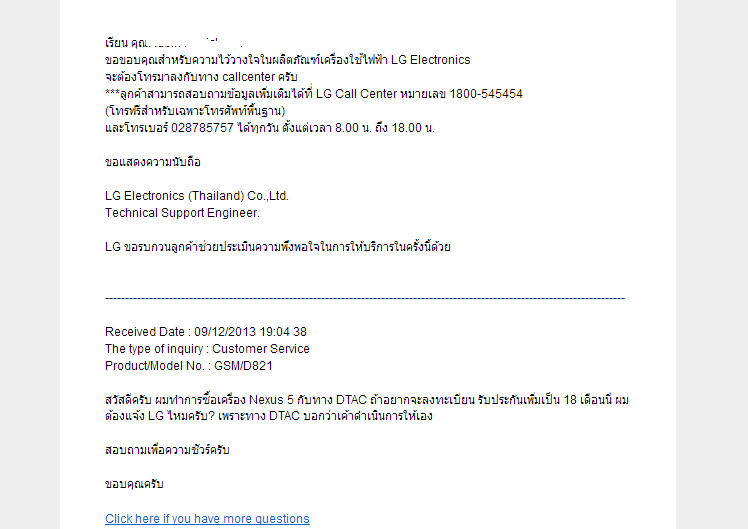 Nexus 5 ซื้อ online กับ Dtac โทรไปลงทะเบียนกับ LG เจ้าหน้าที่ให้แฟกซ์ใบเสร็จกลับไปด้วย