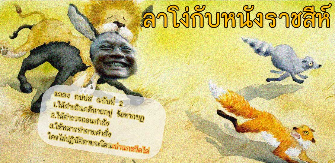 บัดนี้ มวลมหาประชาสัตว์พวกเราได้อำนาจปกครองป่ามาแล้ว ขอให้ เสือ หมาป่า จิ้งจอก ช้าง มารายงานตัวกับเราโดยด่วน